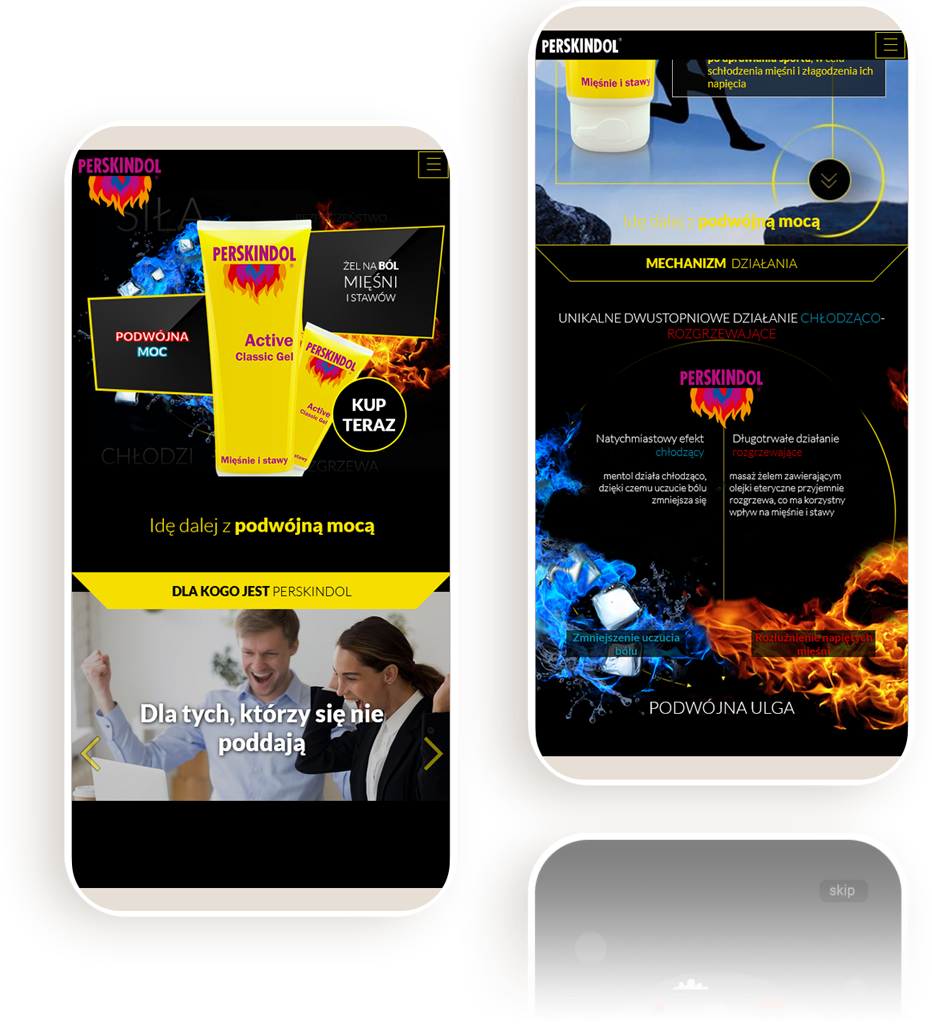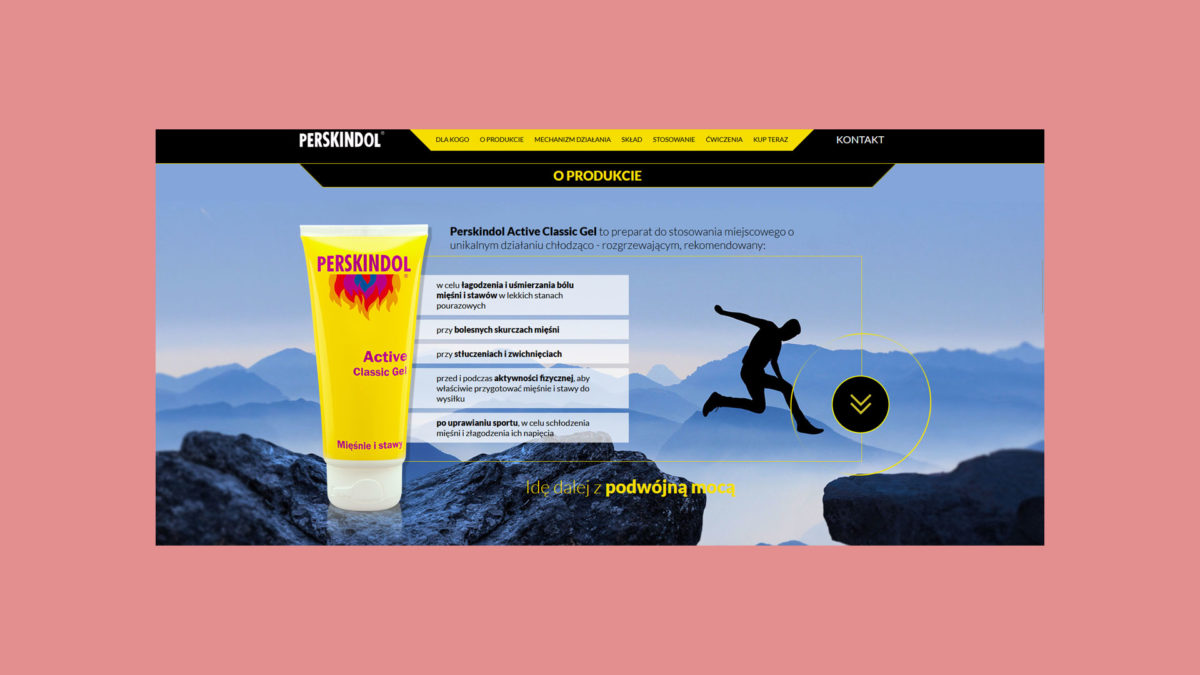 The agency was tasked with designing a new website for the Perskindol brand and implementing it in the WordPress CMS system. Technologies used included HTML5/CSS3, JS, PHP, and Adobe Photoshop. Perskindol Active Classic Gel is a local application preparation with a unique cooling and warming effect, recommended for relieving and alleviating muscle and joint pain in mild post-traumatic conditions.